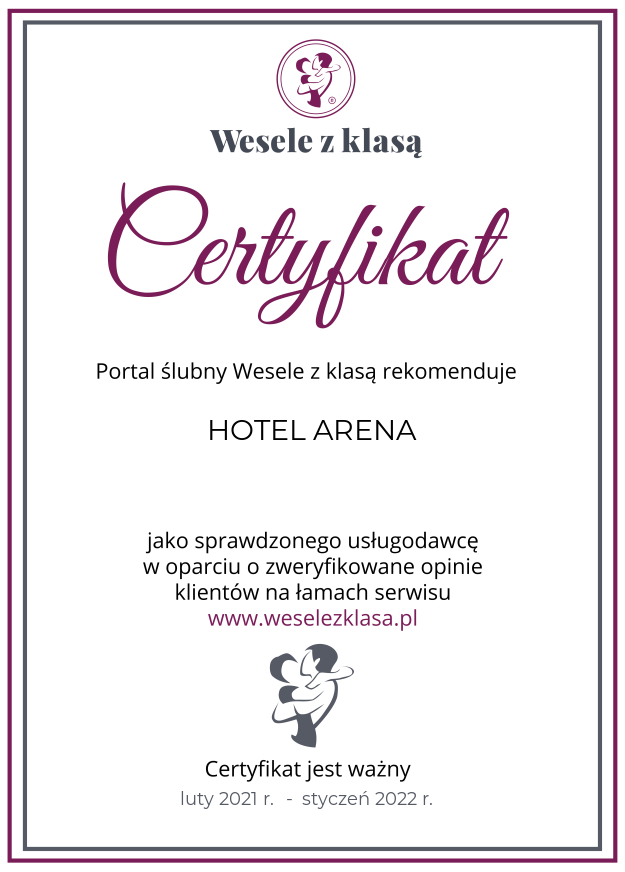 HOTEL ARENA spa & wellness to MIEJSCE, w którym organizujemy wesela dostosowane rozmachem i charakterem do oczekiwań Młodej Pary. Wychodząc z założenia, że Dzień Ślubu to jedno z najważniejszych wydarzeń w życiu, z pełnym zaangażowaniem pomagamy zorganizować to wydarzenie tak, aby spełniło marzenia Nowożeńców.
